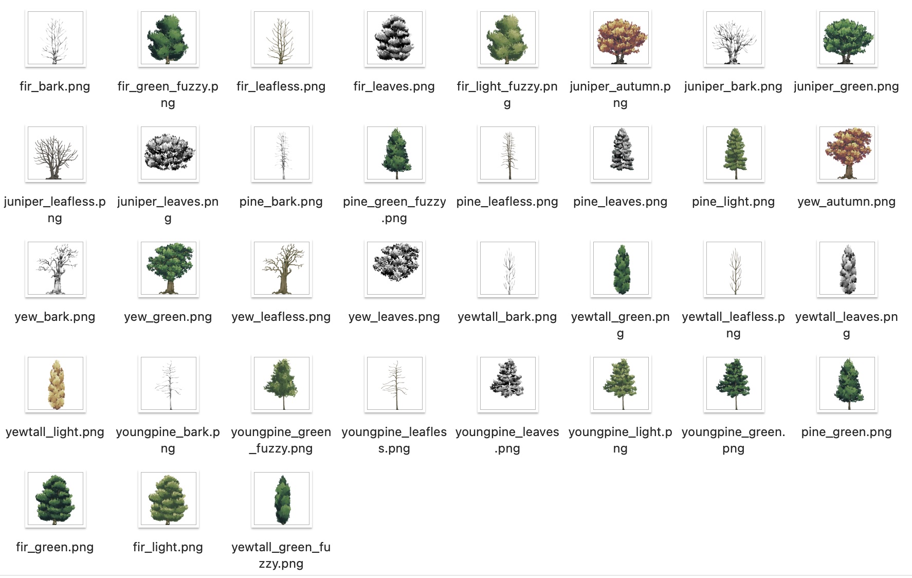 - more trees (remaining screenshots): Two yews, two pines, and a juniper. Includes some fuzzy variants.