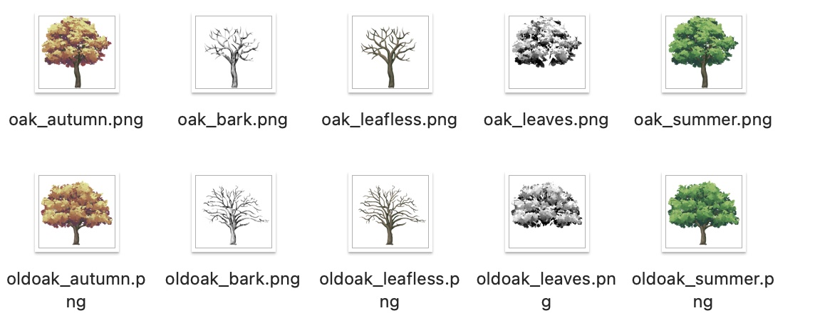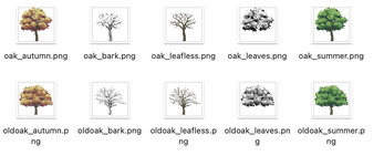 Collections of 2409 × 2288 pngs, which come with green and autumn leaf variants, leafless version, and grey-scale leaf and bark images: